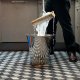 Slide out old sponge. Line up metal teeth on new sponge head with metal rail between mop rollers and slide it in, following arrow direction on sponge head. To lock in sponge head, pull lever away from mop handle and return to usage position.